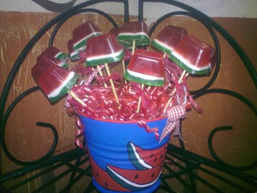 Brochetas con sandia mini... de verdad huelen a sandia!!! Jabones de glicerina Brochetas y paletas Eventos Fiestas Infantiles Arreglos con jabones Otros eventos